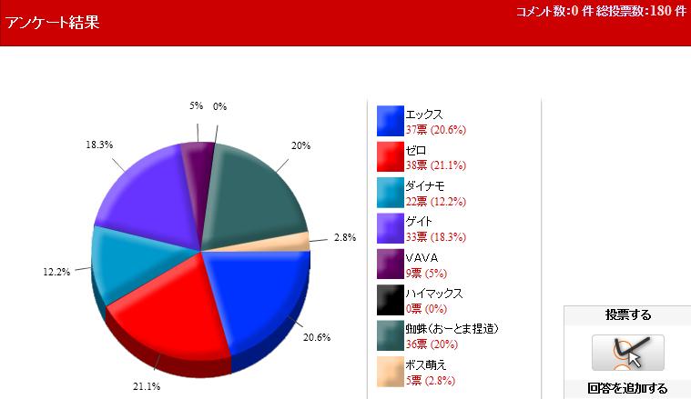 ゼロ様とゲイト様が僅差で競っているのが怖いです。きっとナイトメアホールVSゼットセイバーでバシバシですよ。視線もバチバチですきっと。まつげもバチバチですきっと。二人とも超美形ですから、そのけんかはたとえつかみあいでも美しいのではないでしょうか!…いや、けんかはけんかだなwww
